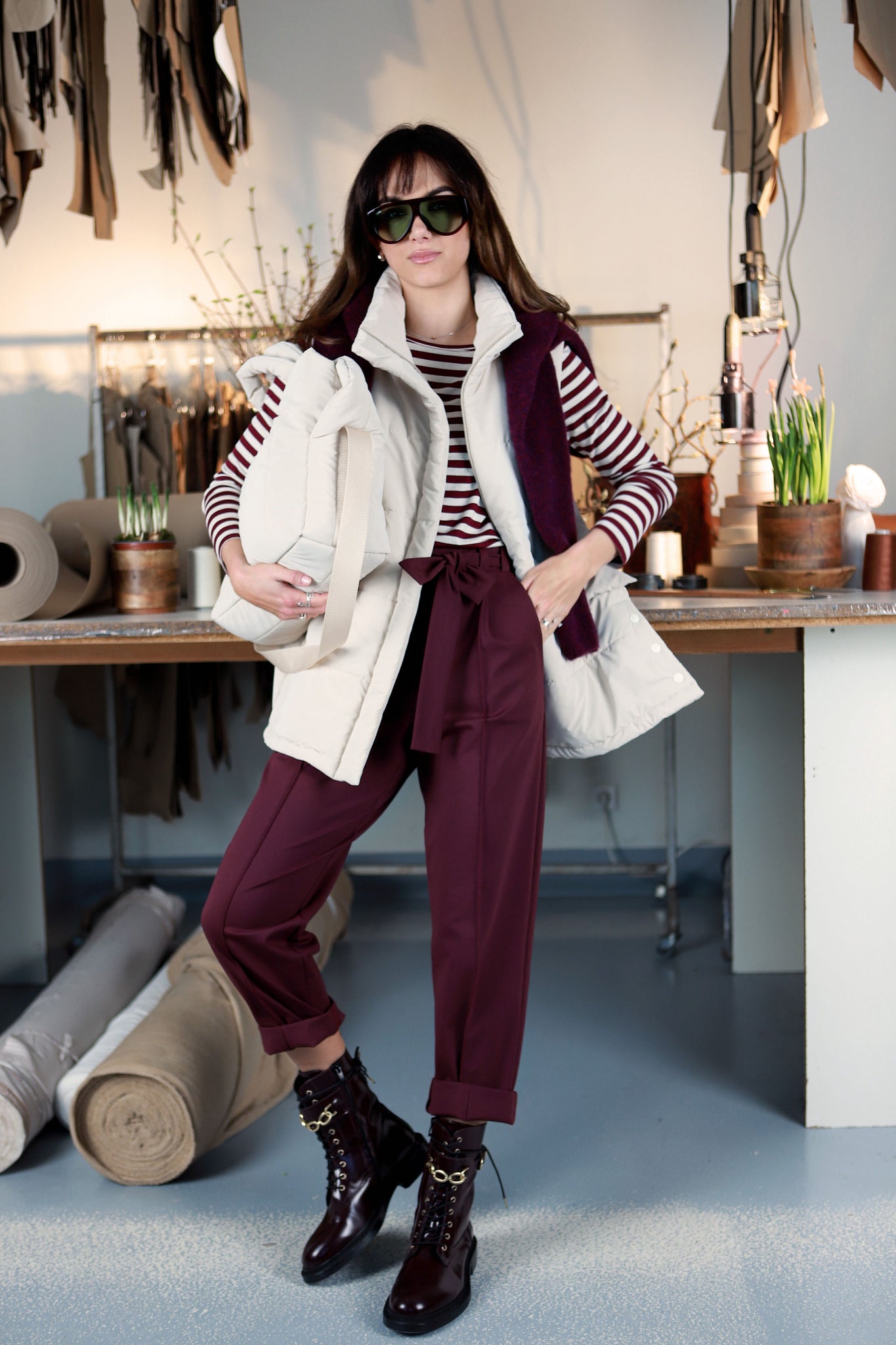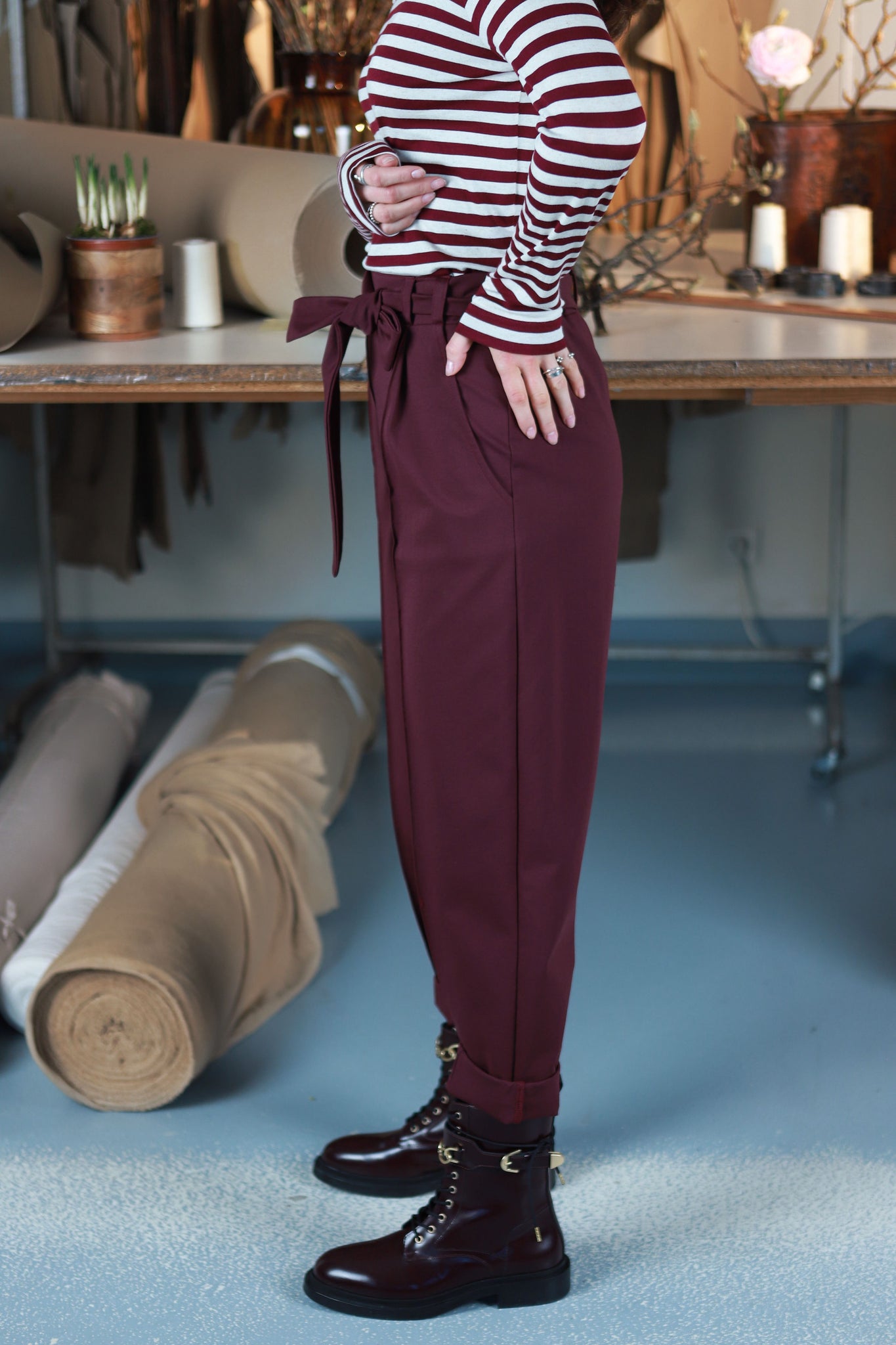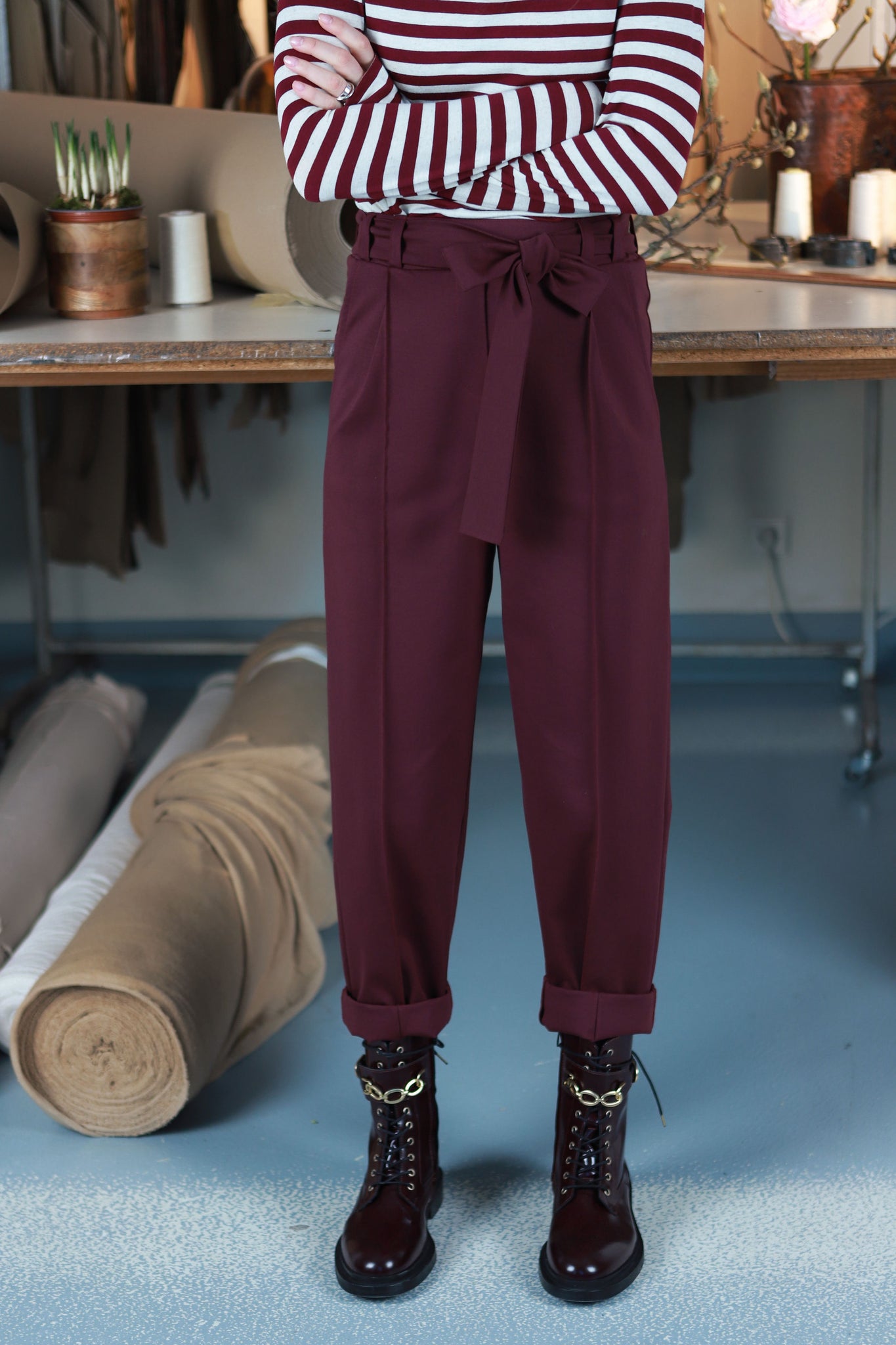 APRAŠYMAS: Kelnės, kurias „dėliojant“ buvome sau išsikėlę tikslą: kad nebūtų visiškai laisvalaikinės su „treninginiu“ prieskoniu, bet ir nebūtų totaliai kostiuminės su „ofisiniu“ poskoniu. Visada dėliodami kolekciją stengiamės išpildyti visokių stilių gerbėjų norus. Siūlydami ,,ofisines" linijas ir jos priešingas - ,,laisvalaikines"- turime kūrybinį vairą išvinguriuoti taip, kad atsirastų tiltas tarp šių dviejų stilių. Dažniausiai tokį stilių vadinu „Office comfy“, ir tada komandai aišku, apie ką kalbu. Šįkart ir vėl taikėme į viduriuką tarp klasikos ir ,,treningiukų". O galop, iš visų pusių apžiurėjus gautą rezultatą, manome, kad mums pavyko ,,išvinguriuoti". Kelnėms parinkome tamprų, bet standų ir visišku sportiškumu „nespygaujantį“ trikotažą, kurio ilgaamžiškumu ir be galo lengva priežiūra jau esame įsitikinę ne vieną kartą. „Apdovanojom“ kelnes daugiau mažiau klasikiniu modeliu ir naująja ,,burgundy" spalva. Sujungus šias dvi savybes, gavome „mišrūnes" 2in1 -drąsiai lydės į ofisą ir ištikimai „tarnaus“ su baltais marškiniais bei švarkeliais, bet bus puikios ir kasdieniuose deriniuose, kai treningai atrodo per daug namudiški, o kostiumai – per daug formalu. Todėl „pakrikštydami“ jas „LOVE“ vardu...manome, kad neprašovėme ir anei „gramo“ nepamelavome, nes toks universalus rūbas turi būti mylimas. ,,Makaryčių" pridedu faktą, kad kelnės yra pasiūtos iš to paties audinio, kaip ir marškinėliai ,,Love" ir ,,Full of love", tad pasirinkdamos duetą - iškart galite lengviau atsikvėpti - vienas ,,lengvas Pavasario (o gal net Vasaros) rytas" jau užtikrintai turi savo derinį.