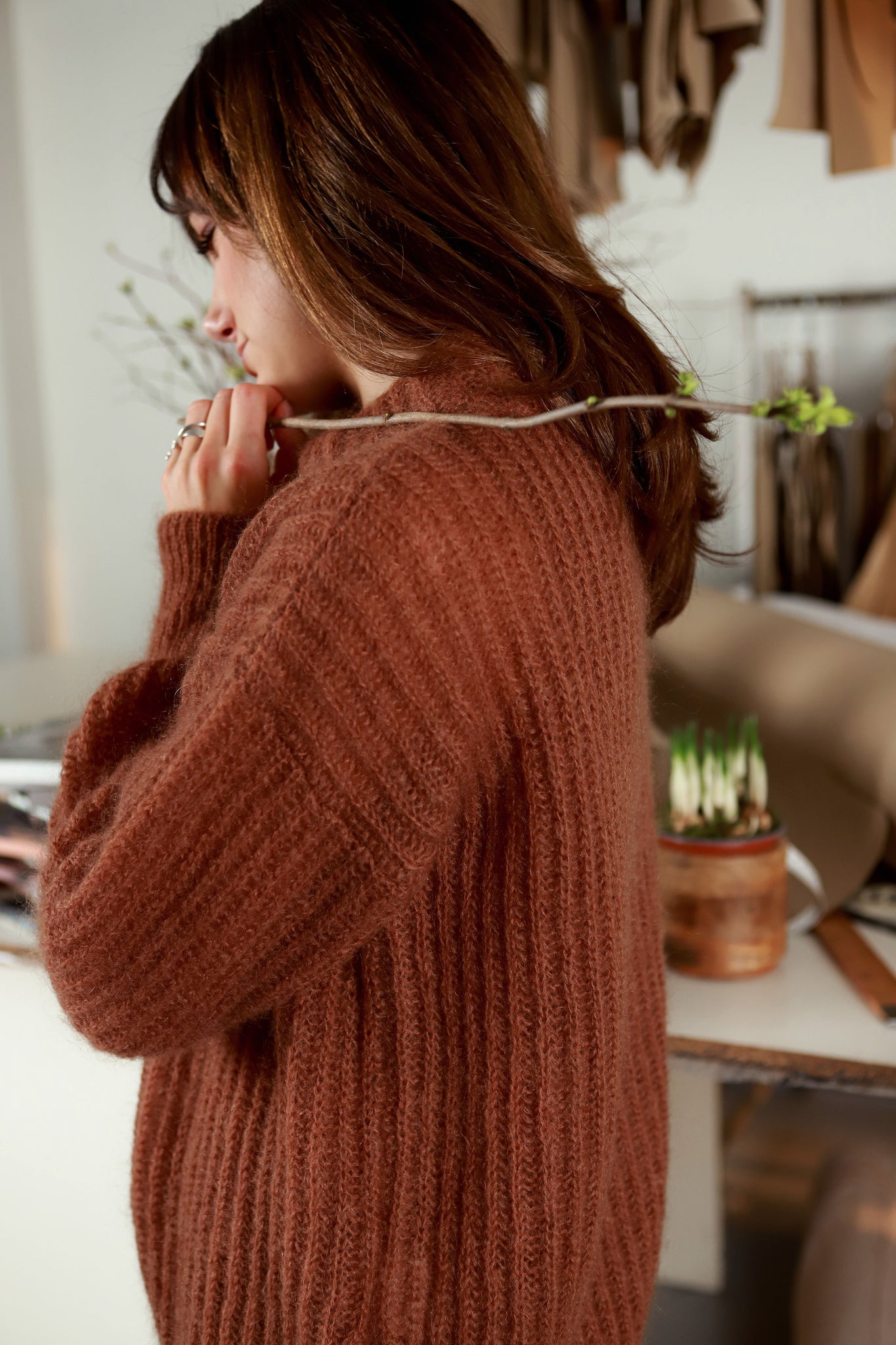APRAŠYMAS: Pirmą kartą savo kūryboje pasiryžome savo norimu atspalviu dažyti ne audinį, o siūlus. Kadangi mėgstamų siūlų paletėje neradome cinamoninio tono, leidomės į mums naują, dar nepažįstamą kelionę ir po daugybės bendravimo akimirkų su itališku siūlų fabriku galop mes rankose glaudėme tobulai kolekcijos ,,ryžumui" tinkantį siūlų kamuolį. Iš kurio mes numezgėme du puikius megztukus ir šaliką. Rinkomės kokybišką, patikimą ,,superkid" moheros siūlą, kuris nepaprastai palengvina gaminį (paverčia jį it debesėliu), o kartu mezginys išlieka švelnus net jautriai odai. Šis megztukas tiek modeliu, tiek atspalviu puikiai dera prie „Iriso“ kostiumo ir ,,Stokholmo" palto. Megztuko siluetas primena taisyklingą kvadratą, tad tiks ir toms, kurios gerai jaučiasi su laisvesnio modelio megztukais, tiek toms, kurios nemėgsta stipraus ,,oversize".