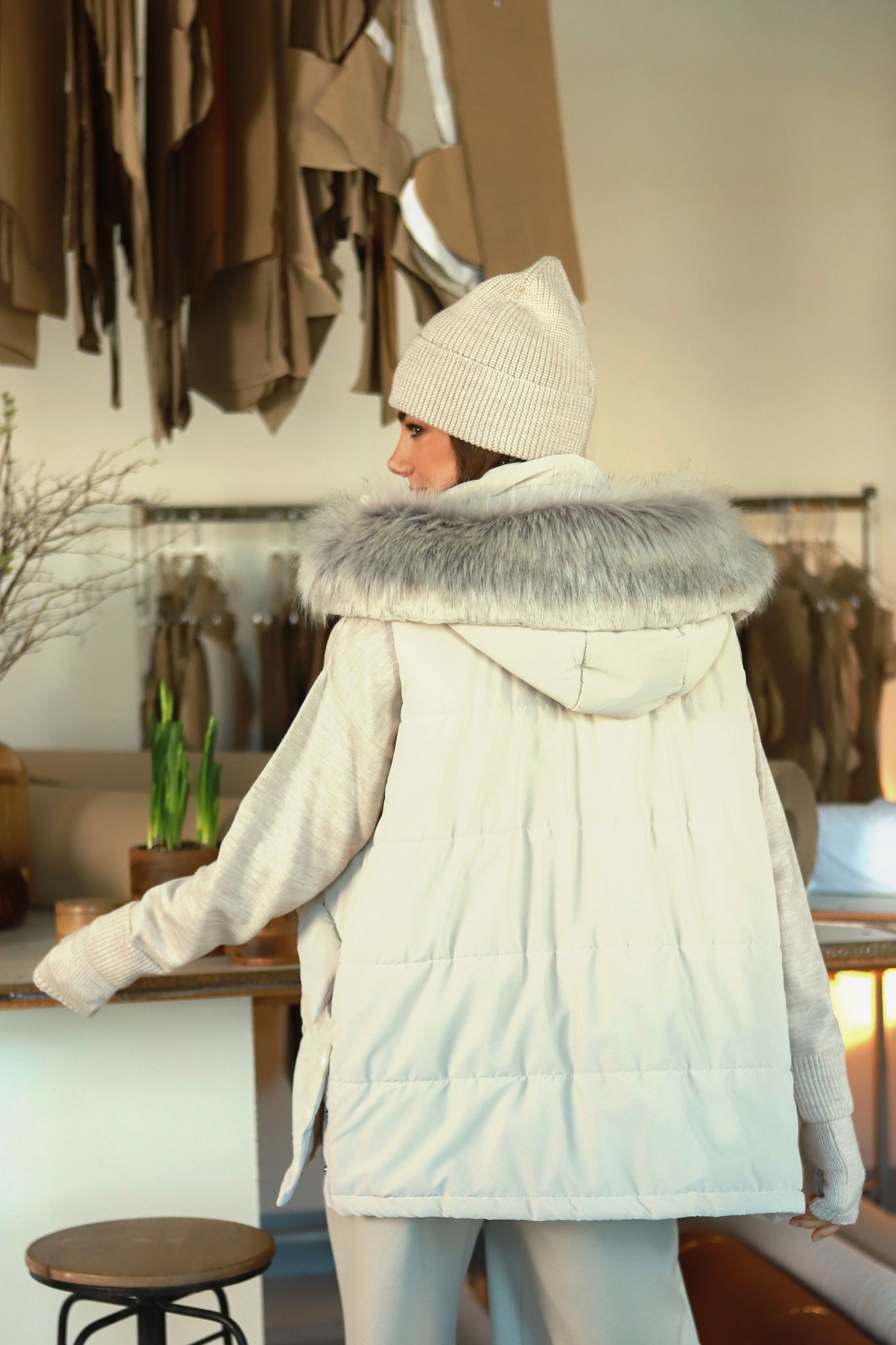- Nusegamas kailinis ,,kapišonas" - leidžia liemenę pritaikyti prie įvairaus stiliaus derinių.