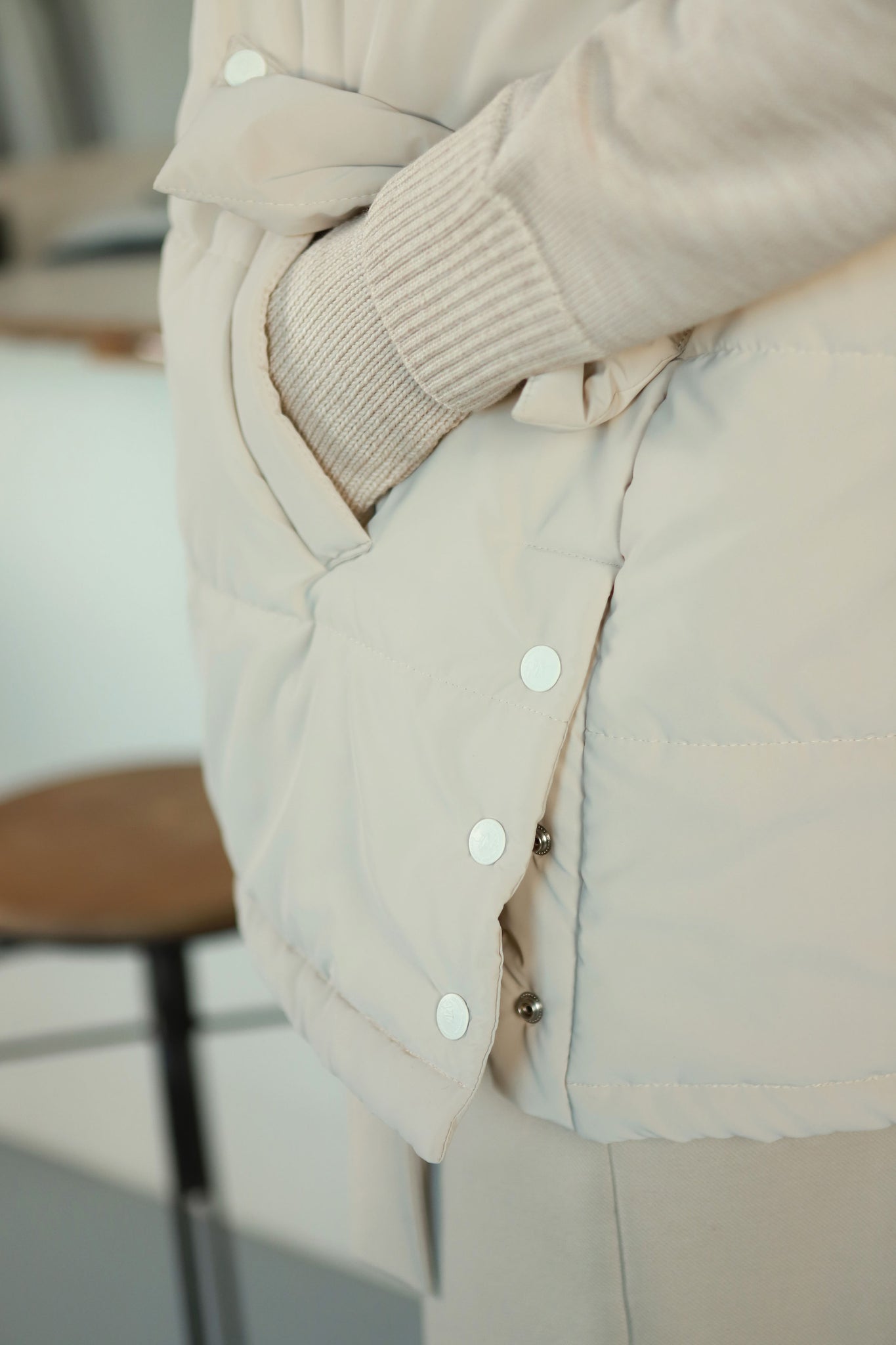 Praktiškumą ir prisitaikymą prie skirtingų nuotaikų sustiprina nusegamas kailis, o prireikus - ir galimybė visiškai nusegti patį ,,kapišoną". Taip liemenė lengvai transformuojasi iš jaukaus, šilto akcento į minimalistinį įvaizdį, tinkamą net ir prie klasikinio derinio.